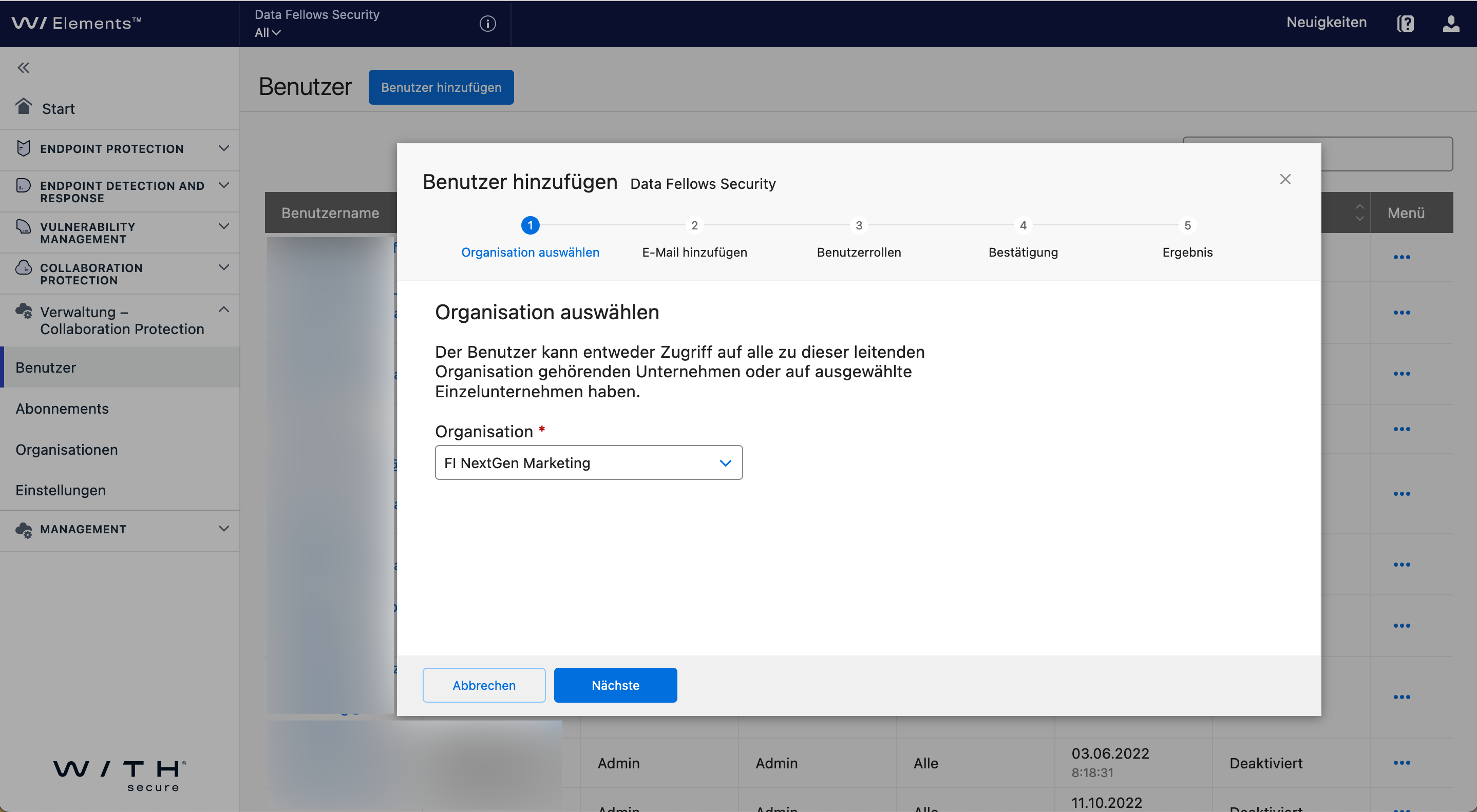 - Wählen Sie im Elements Security Center in der Seitenleiste die Option Verwaltung - Collaboration Protection und wählen Sie eine einzelne Organisation aus, um ein Konto für den Endkunden für dieses spezifische Unternehmen zu erstellen:
