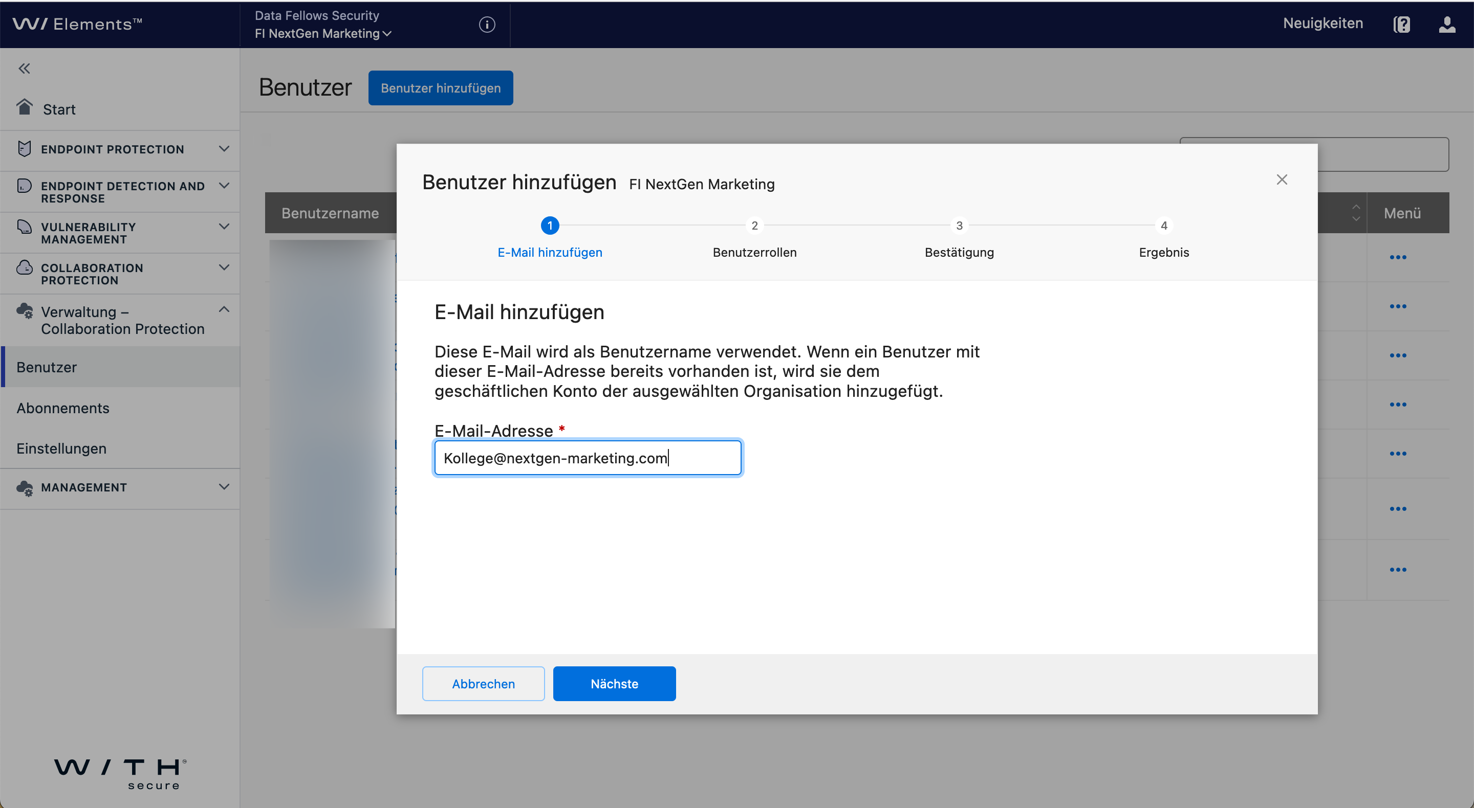 Um ein neues Administratorkonto zu erstellen, wählen Sie im Elements Security Center in der Seitenleiste Verwaltung - Collaboration Protection > Benutzer > Benutzer hinzufügen: