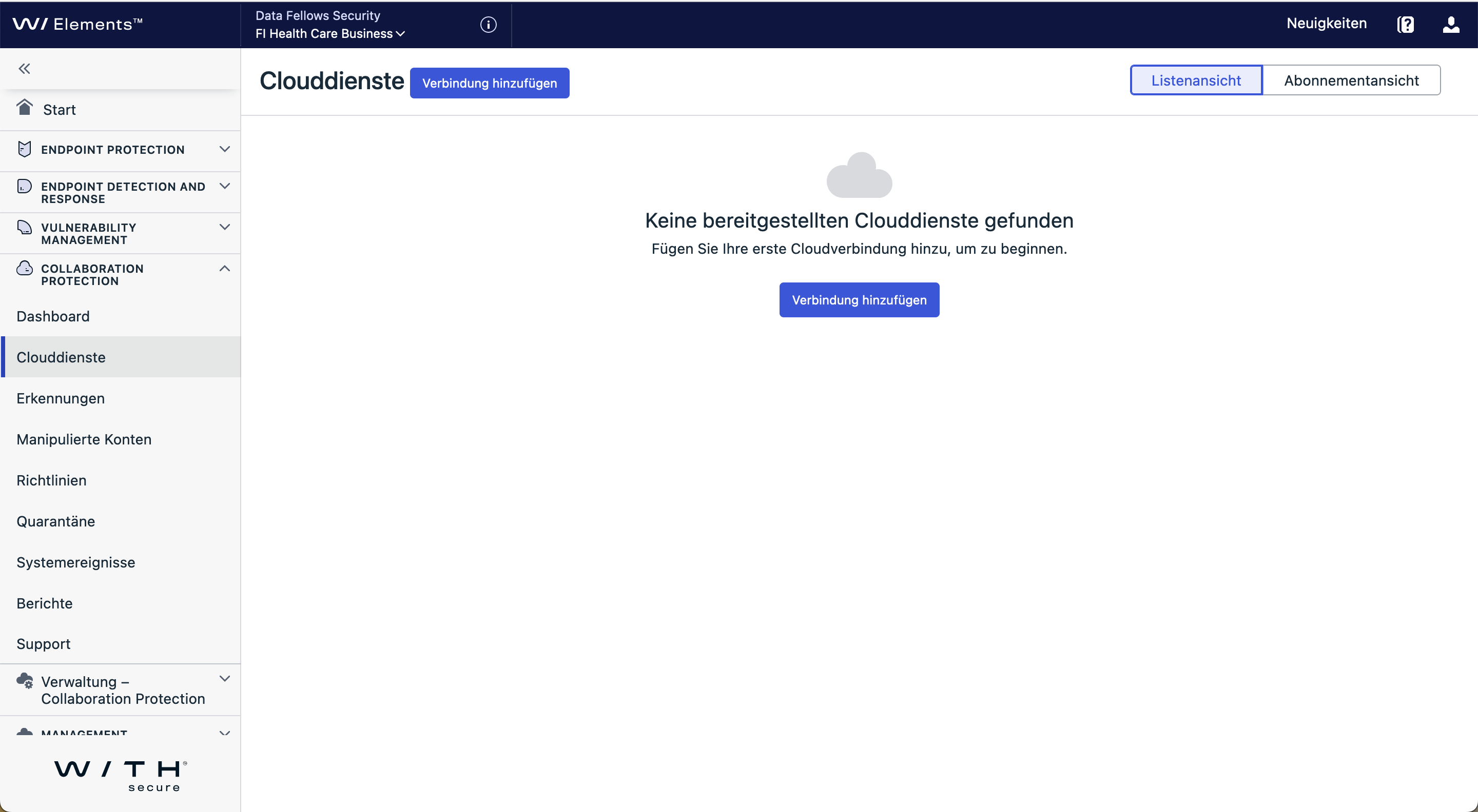 Nachdem Sie das Geschäftskonto erstellt haben, verwenden Sie WithSecure™ Elements Security Center, um das Produkt zu verwalten. Alle Produkteinstellungen befinden sich unter Collaboration Protection in der Seitenleiste.