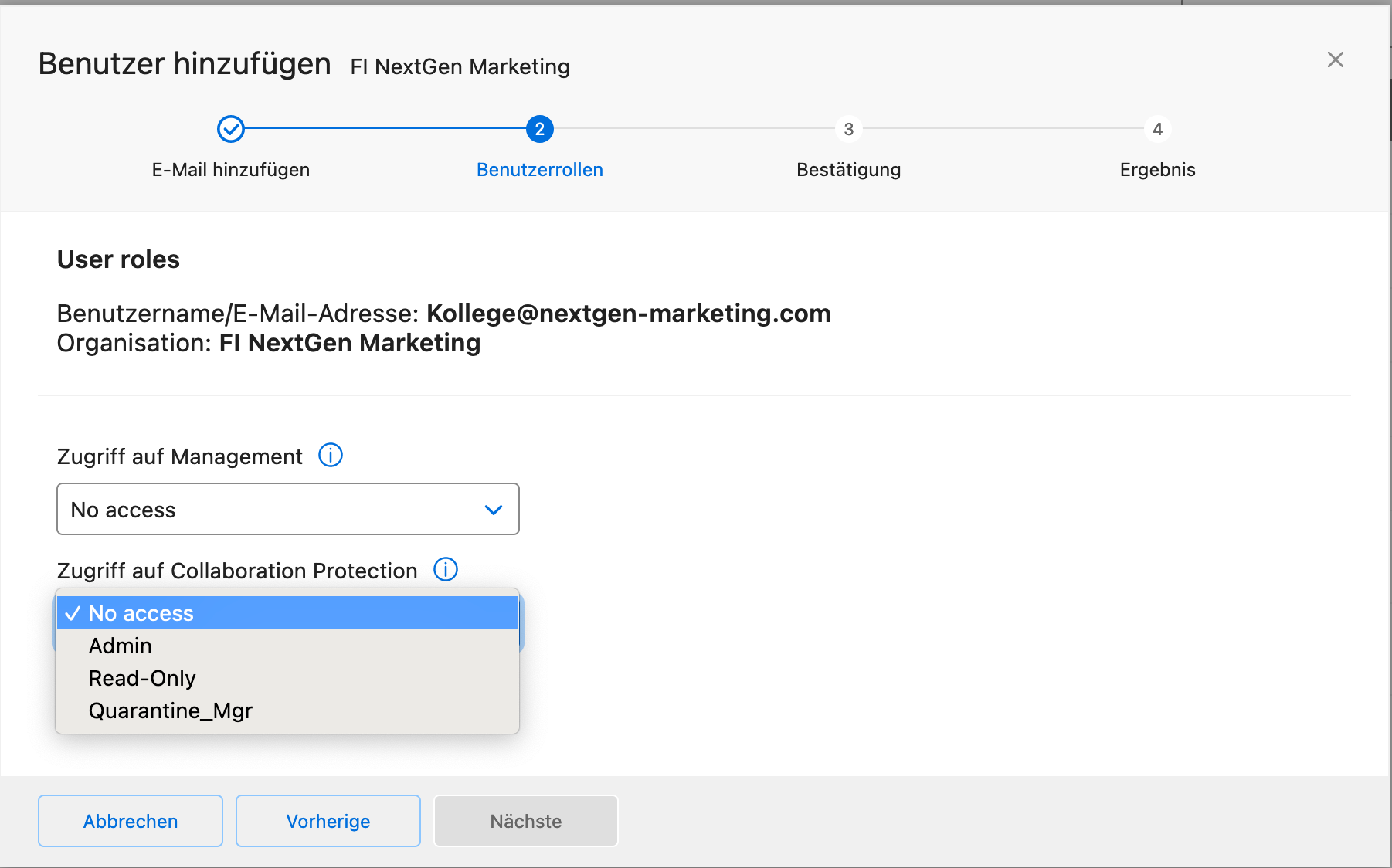 Nachdem Sie die Organisation ausgewählt und die E-Mail-Adresse eingegeben haben, können Sie auswählen, ob das neue Benutzerkonto Management-Zugriff haben soll (das Recht, neue Administratorkonten zu verwalten und zu erstellen) und die Art des Zugriffs auf die Collaboration Protection auswählen, um entweder nur Lesezugriff, Verwaltung von Quarantäneobjekten oder vollen Zugriff zu gewähren: