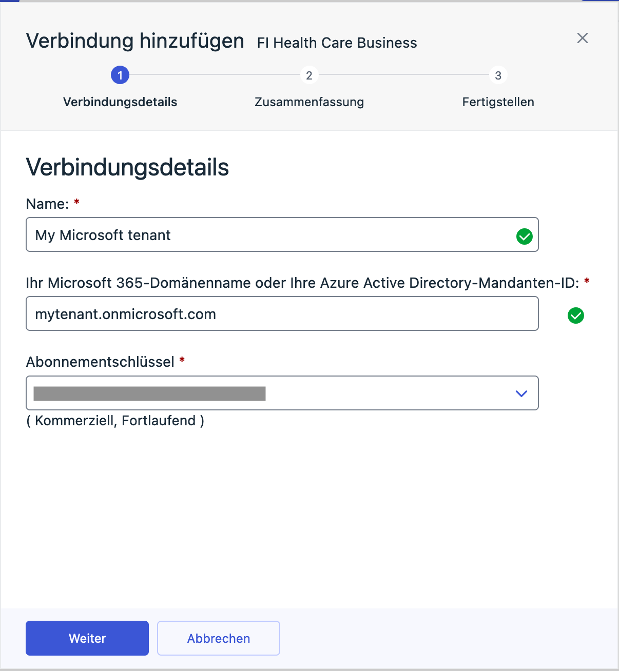 Um fortzufahren, benötigen Sie die Mandanteninformationen und die Administratoranmeldeinformationen Ihres Microsoft 365-Mandanten, um die Verbindung zu autorisieren: