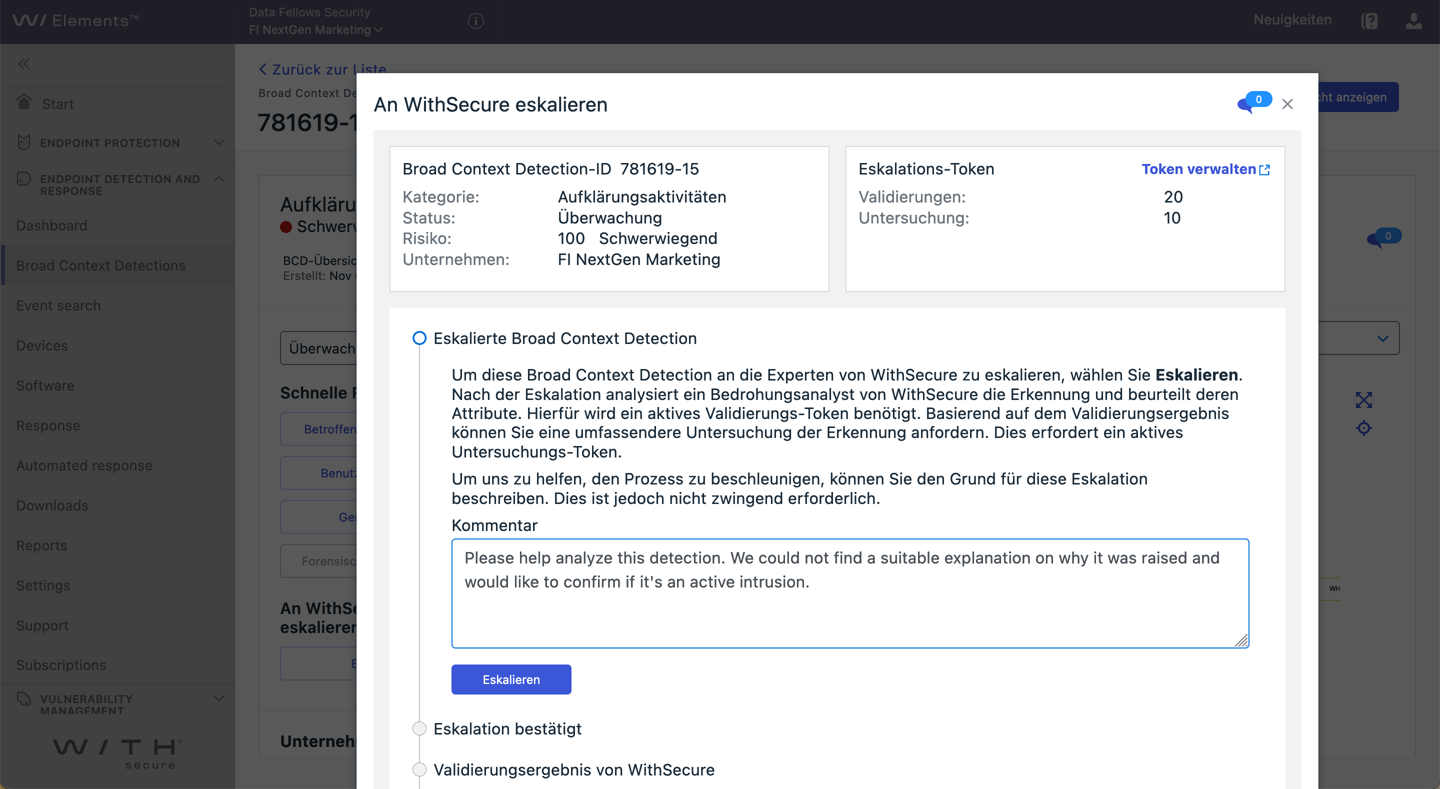 Nachdem Sie den Vorfall bestätigt haben, wird er eskaliert und von unseren Analysten bearbeitet.