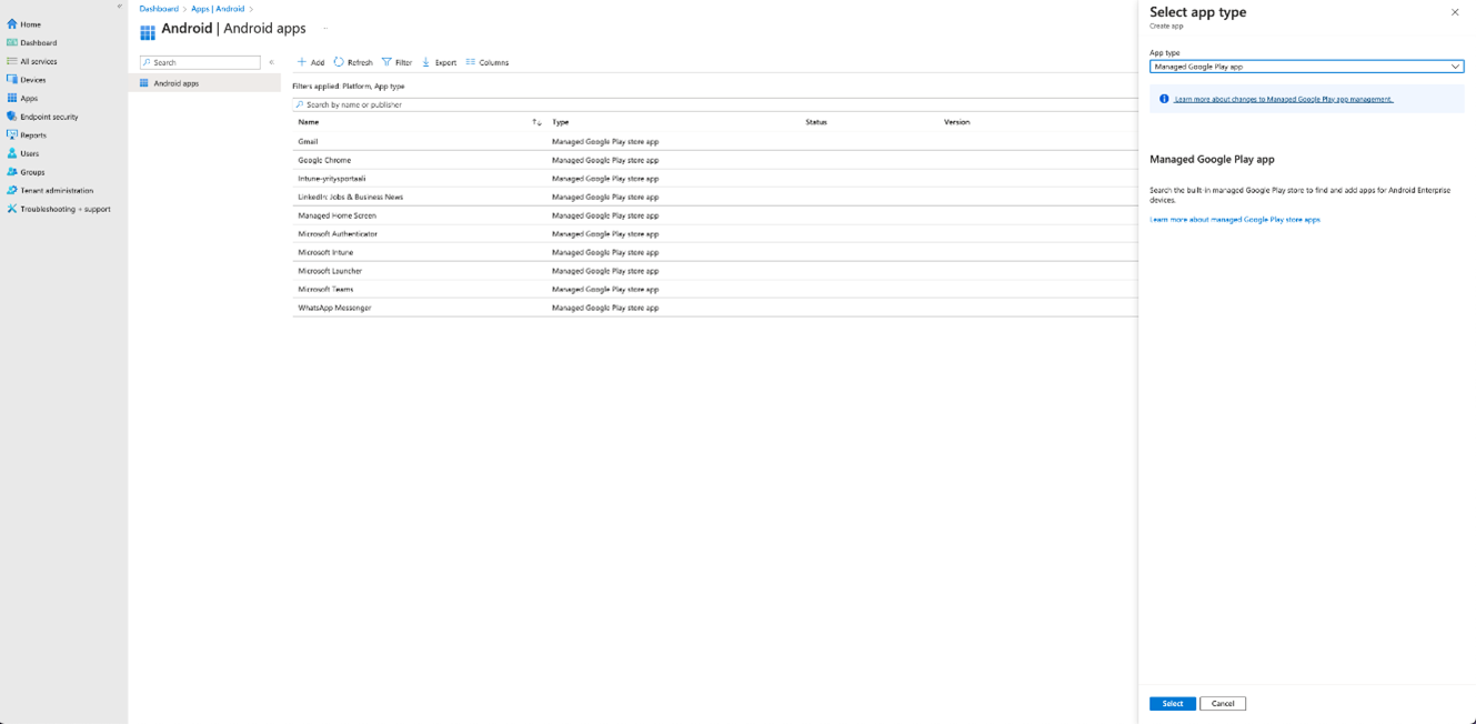 - From the App type drop-down menu, select Managed Google Play app, and then select Select