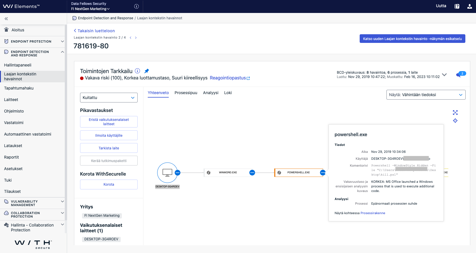 Jos haluat lisätietoja tuotteen käytöstä, siirry Elements Endpoint Detection and Response -ohjelman käyttöoppaat.