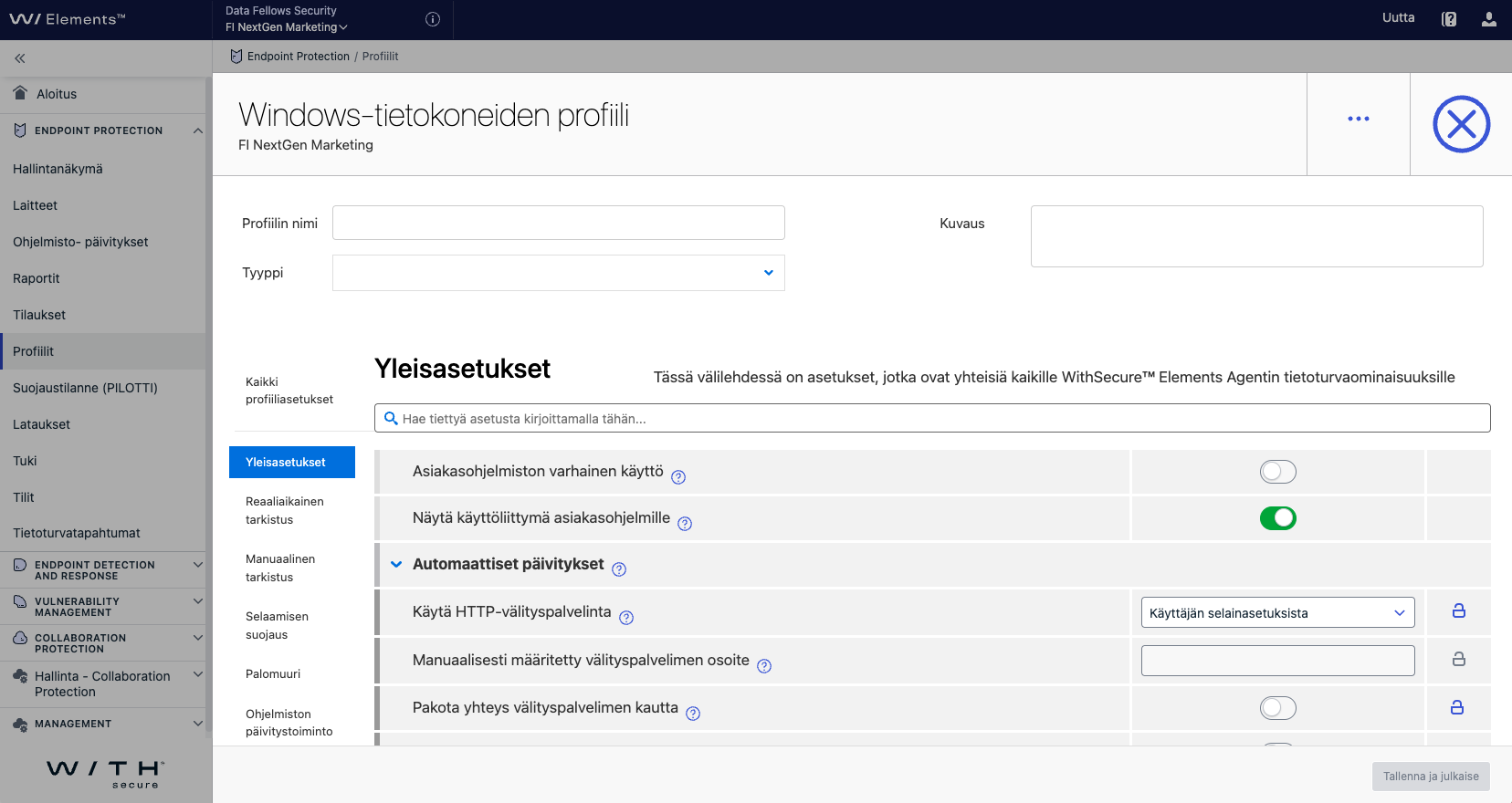Määritä tietoturva-asetukset organisaatiosi tietoturvatarpeiden mukaan, anna profiilille nimi ja valitse sen jälkeen "Tallenna ja julkaise".